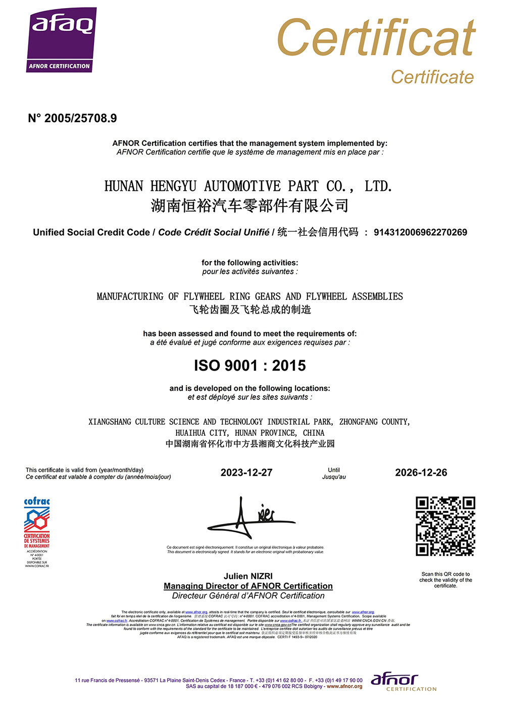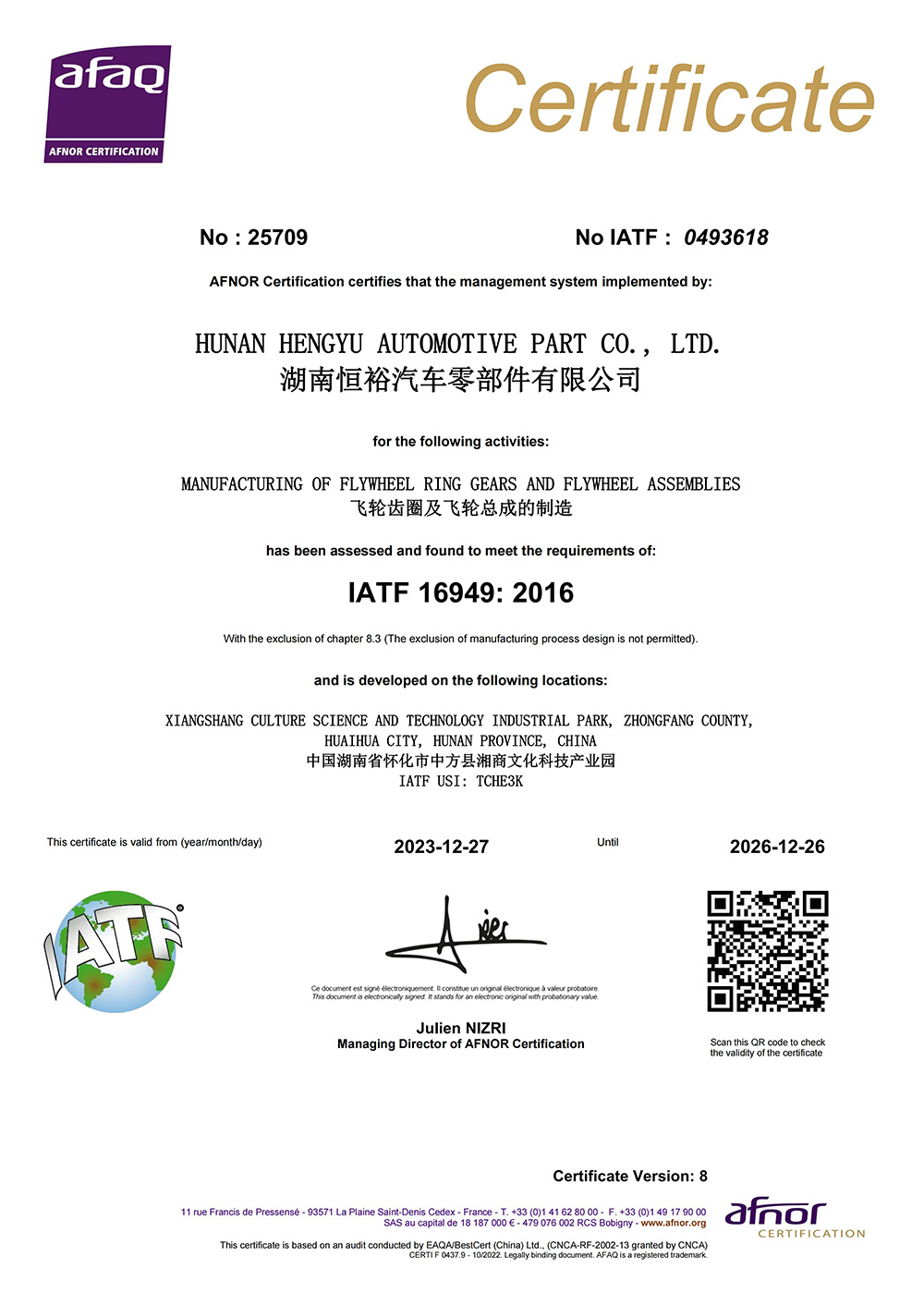 恒裕于2002年通过ISO9001:2000质量体系认证,2005年通过ISO/TS16949:2000质量体系认证。本公司严格执行 JB4187 — 86 《汽车发动机飞轮齿圈技术条件》的部颁标准,以及美国康明斯公司起动齿圈的国际标准,始终坚持“质量是生命,精益再求精”的质量方针。建立了厂长、主管副厂长签定责任书的质量负责制,健全了三级质量保证体系,完善了计量检测手段,坚持每批产品理化检验、金相检验、每件产品长度检验与无损探伤。 5 位高级工程师、 20 位中级技术人员、 30 多位检测人员严把质量关。确保出厂的每只齿圈都符合主机厂的图纸及技术标准要求。